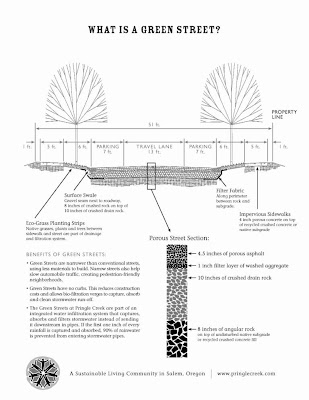 From their site: "Pringle Creek Community in Salem has one of the largest installations of pervious asphalt in the country. The green streets are narrower than conventional streets, using less materials to build and calming traffic. They have no curbs, which reduces construction costs and allows vegetated swales to capture, absorb and clean stormwater runoff."